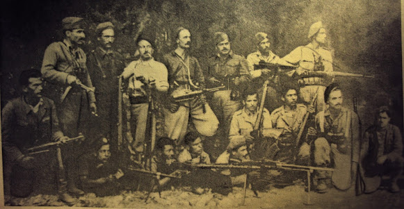 Κισαμίτες αντάρτες του ΕΛΑΣ, που απέκρουσαν την επίθεση των παρακρατικών στα γραφεία του ΚΚΕ στο Καστέλι Κισάμου. Κάτω αριστερά, εικονίζεται ο αντάρτης του ΕΛΑΣ και του ΔΣΕ Ευθύμης Μπιτζανάκης, από τα Παλιά Ρούματα.